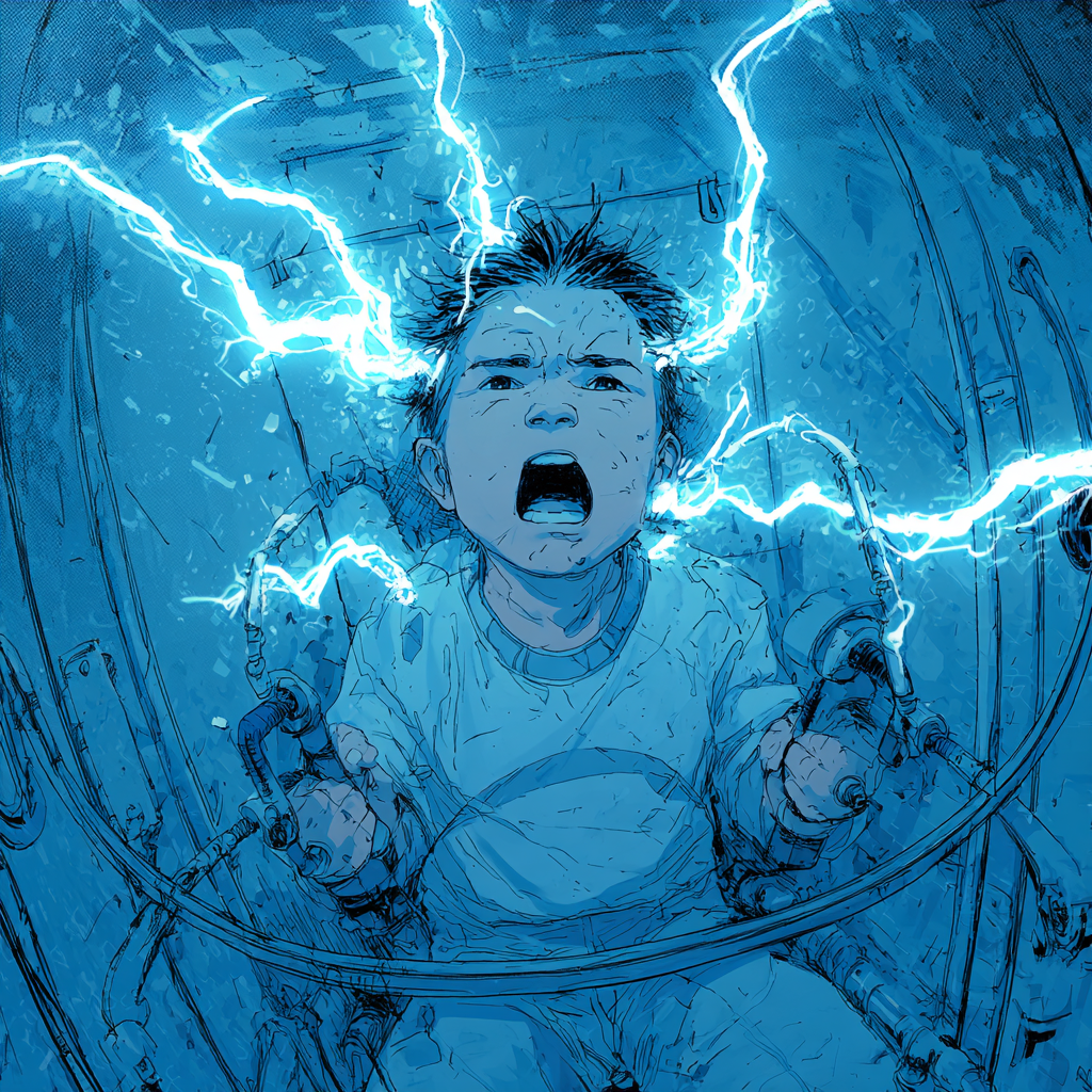 As the mother ran to the pod, she saw the inside flicker intensly and screamed as she ran faster and faster to the pod. She tore open the pod and looked at her son. He was blacked by the shock, still with smoke coming off of him. Just then a mechanism in the pod opened a shaft that swept the boy down the tube. As he slipped, he let out a low groan. He was still alive! The mother despritly grabbed for the boy's hand, but was less than an inch from making contact. When the tube opened, it revealed the text "to incinerator" with an arrow inside of the tube.